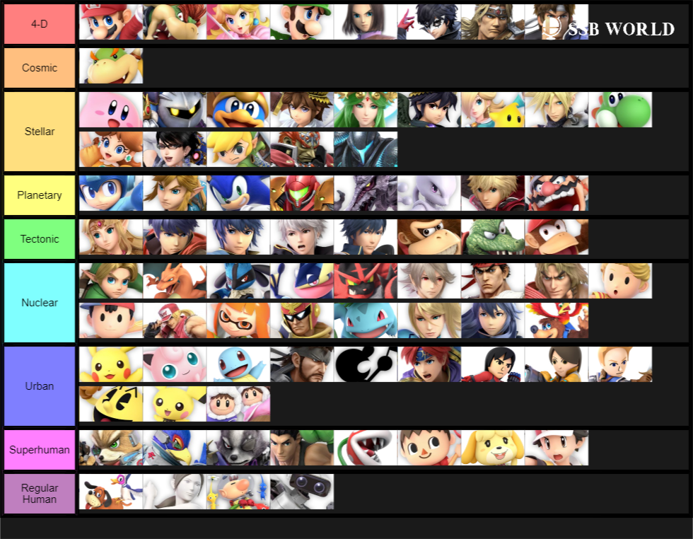 4 from nintendo wii u produced by the smash back room and last updated on december 11th 2017. This page shows smash 4 tier list. Within the tier list youll find character movesets strengths and weaknesses. It is current as of december 11th 2017 and reflects version 117 of the game. Tiers for super smash bros. I think hes at least mid tier 2.